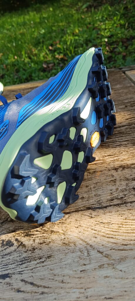 La semelle extérieure Vibram® Megagrip avec crampons de 5 mm Traction Lug assure une accroche constante sur terrains humides, meubles ou rocheux, pour une foulée sûre même dans des conditions imprévisibles.