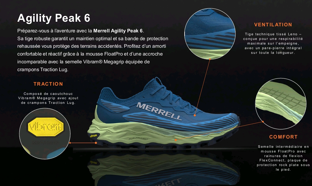 Pour Frédéric Tranchand, champion du monde de trail court 2025 et athlète Merrell : « L’Agility Peak 6 est la chaussure que j’utilise le plus. Sa polyvalence est vraiment idéale et on sent qu’un nouveau cap a été franchi par rapport à la version précédente. ».